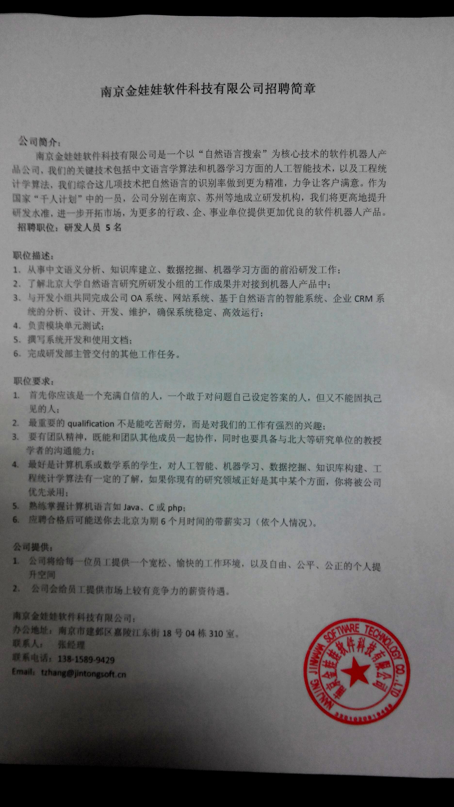 【招聘】金娃娃软件科技有限公司长期面向我系招聘实习生和全职