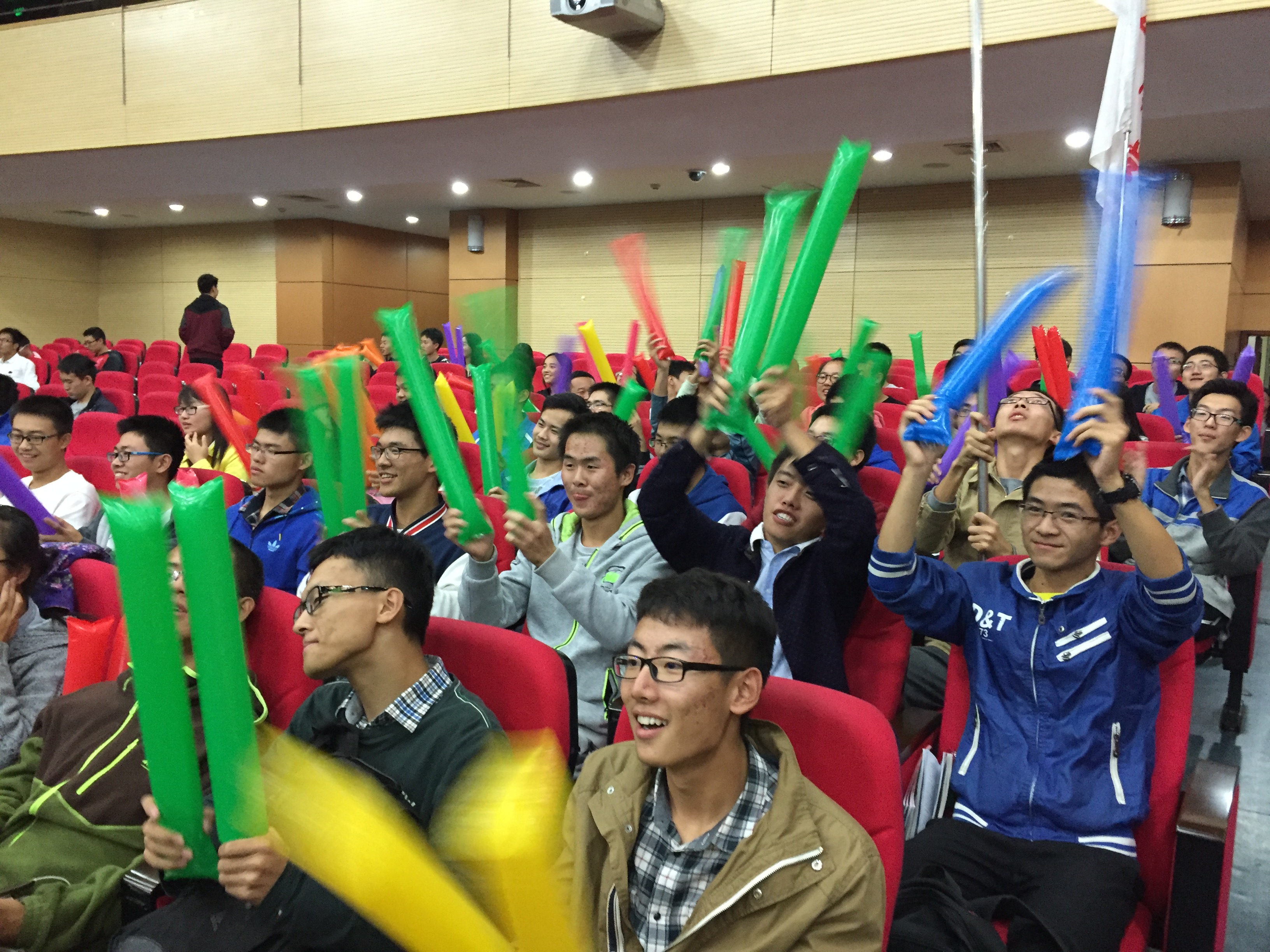 比赛分为必答题、道具题、抢答题和命题演讲四个环节,八支队伍错落有致地分坐在舞台左右两侧。必答题进行比较顺利,参赛选手们准备充分,沉着应对。道具题则是实力与运气的综合比拼,我系代表队抓住时机,表现优秀,并且幸运地获得吸取其他代表队15分的道具,这极大鼓舞了在坐的同学们。观众席上的同学们欢呼着,兴奋地敲打着手中的加油棒。抢答题更是将全场气氛推向高潮,题目以视频纠错的形式。抢答器的声音此起彼伏,气氛紧张。