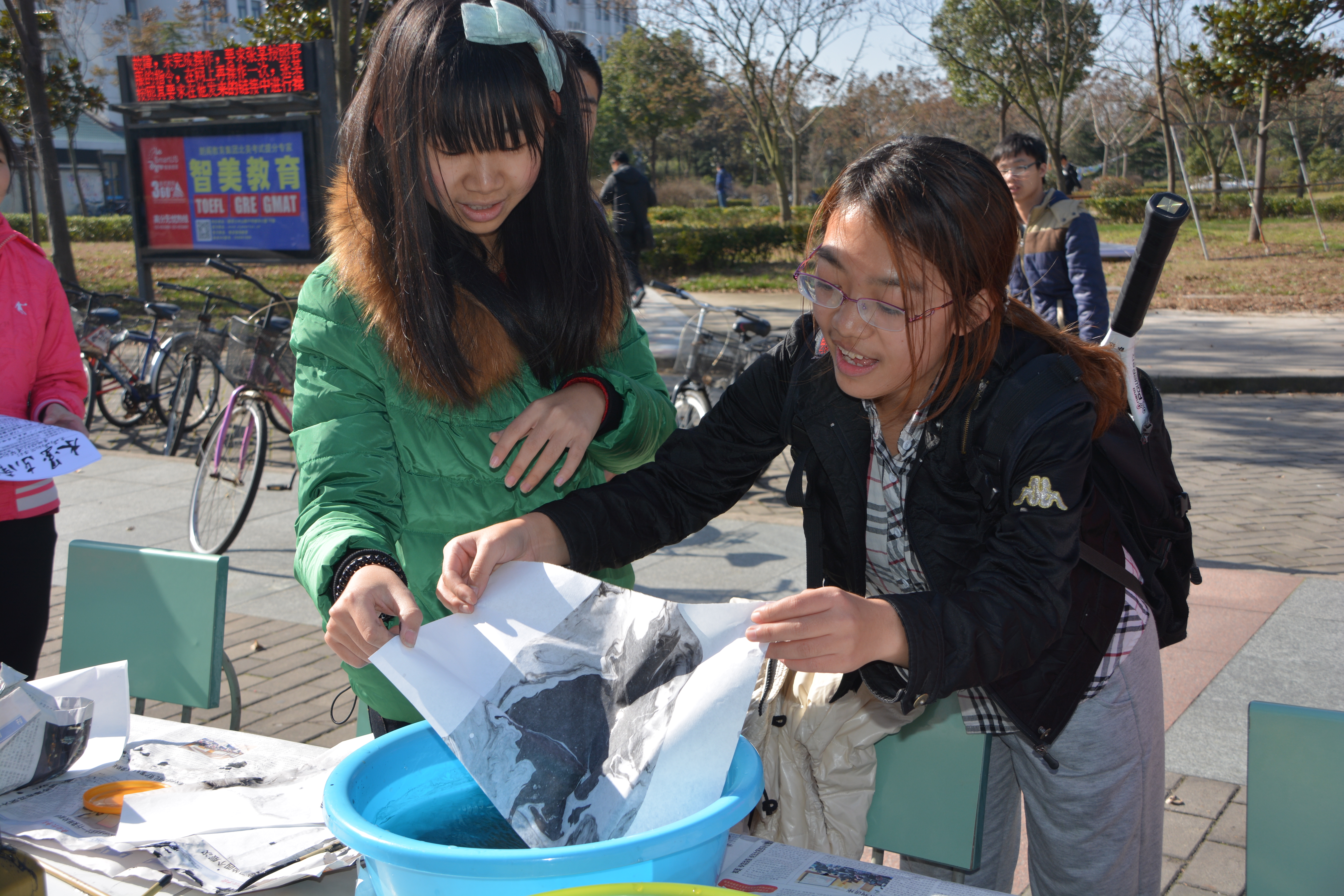 为扩大活动影响力,121日,我们在梅园桃园食堂门口以小活动的形式进行活动宣传。班委成员提早到现场进行布置,拉起了横幅,摆放好了桌椅。支部同学也早早在食堂前准备好笔墨,虽寒风袭人,但墨香阵阵,浓能远溢,支部成员都以饱满的热情等待着同学们的到来。中午11:30左右,同学们开始陆续经过,由本支部的两名同学现场用“吸附法”进行创作,我们热情地邀请驻足观看的同学一起用“吸附法绘制属于他们的作品。除此,还有同学大展身手,尽情挥洒笔墨,书写出端正俊秀的毛笔字。在班长和团支书的领导下,同学们喊起水墨东南,书法绘画,欢迎参与的口号,并发放我们支部精心设计的传单,耐心地为上前询问的同学讲解我们的活动。活动期间,有位支部同学被浓厚的文化氛围所感染,不禁哼唱起了青花瓷,缓缓抒情,歌声动听,大家一起放声歌唱,我们的心也随着歌声传遍了校园。更有我系辅导员、学生会主席的热情参与。