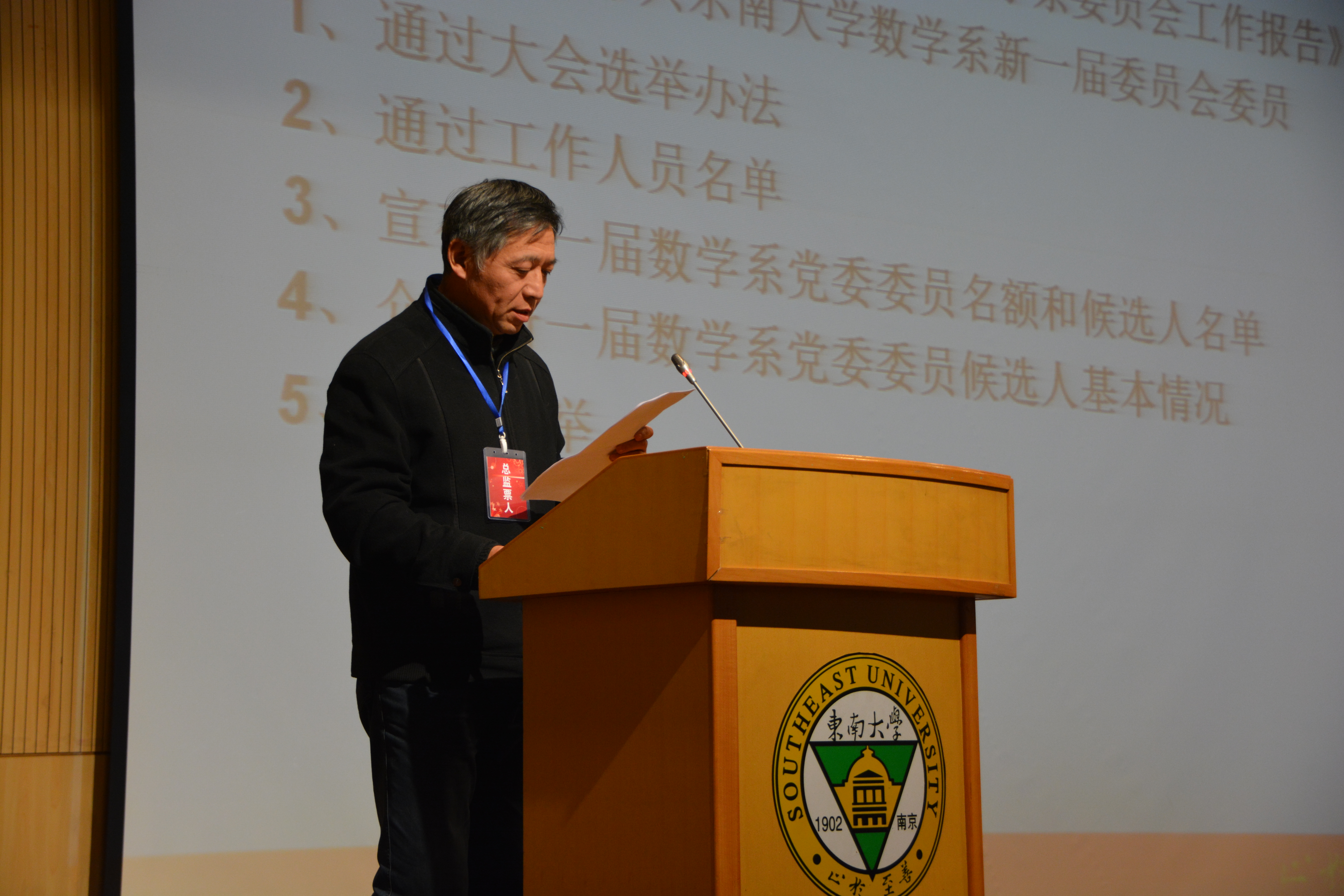 根据《中国共产党章程》及《中国共产党基层组织选举工作暂行条例》有关规定,按照学校党委的统一部署与要求,经过精心筹备,我系党委于 12月30日中午在九龙湖校区润良报告厅隆重举行中国共产党东南大学数学系换届选举大会。校党委副书记刘鸿健同志、校组织部副部长刑纪宏同志莅临大会,全程指导、监督整个会议,系党委副书记曹海燕同志主持大会。