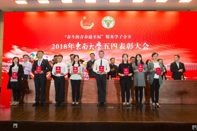 5月7日下午,东南大学2018年“五四表彰”大会暨“奋斗的青春最幸福”精英学子分享活动在九龙湖校区润良报告厅隆重举行。校党委书记左惟、校党委副书记郑家茂以及党委组织部、党委宣传部、纪委、机关党委、教务处、学生处、校团委等相关职能部门的负责同志出席了大会。来自各学院的获奖师生代表、校团委全体同志、各学院团委成员以及部分优秀团员代表共800余人参加了大会。
