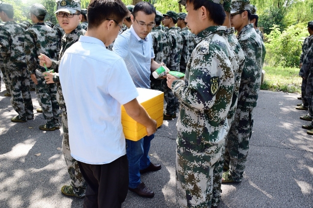 曹院长一行来到训练场的同时,学生会的“专车”也为大家送来了清凉。一杯杯刚刚做好的绿豆冰沙被带到了现场。曹院长带领领导老师们为新生分发绿豆冰沙。一口清爽的绿豆沙,绝对能慰藉干燥的咽喉。在炎炎夏日,新版跑狗图 这个团结的大家庭为大家送来了清凉,这是新版跑狗图 师长对学生的关怀,也是各位学长学姐对新同学的关爱。