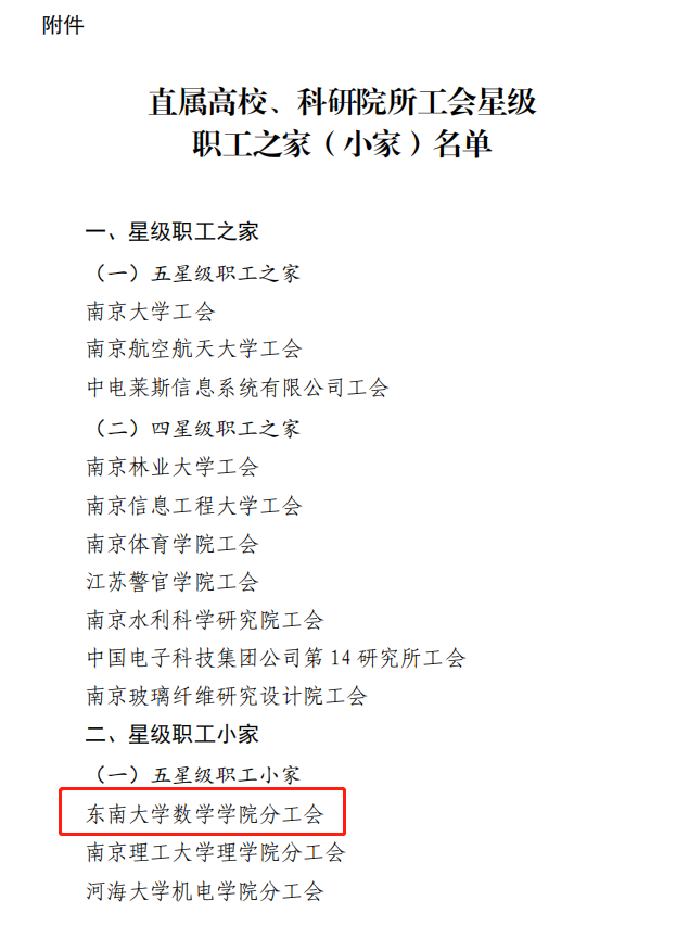 2020年11月,省教育科技工会开展“三互三评”活动,首次增设基层职工小家的评比。按照东南大学工会的统一布置,新版跑狗图 工会积极开展部门工会自查与申报,并经学校评审被推荐为省教育科技工会系统的星级职工小家候选单位。2020年12月,新版跑狗图 工会参加在宁高校东片工会组织的汇报与评审工作。会上,围绕党委中心工作,在加强教职工思想引领、职工之家建设、师德师风建设、工会干部队伍建设、民主管理和民主监督等方面做了全面的展示和汇报,获得与会专家与领导的一致肯定,最后经江苏省教育科技工会综合评定,数学学院工会获得了本次活动的最高荣誉,被评定为“五星级”职工小家。