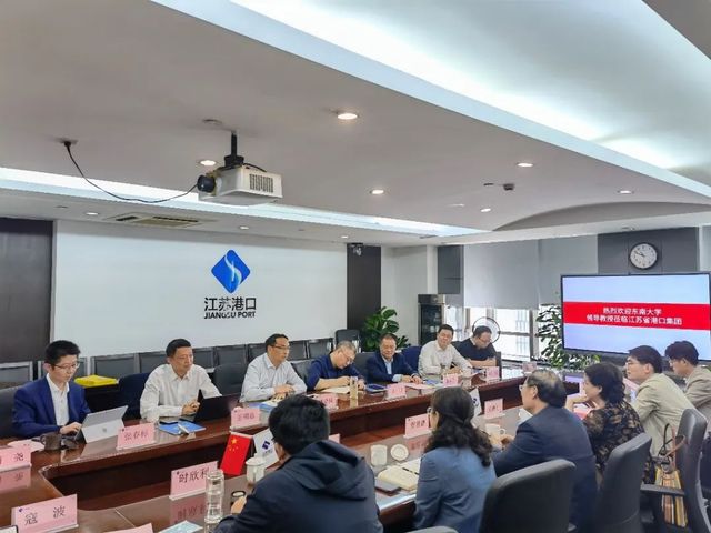 胡建强老师、博士后岳冬冬及博士生寇波等参加此次活动。江苏省港口集团党委委员、副总经理谭瑞兵及相关部门和子公司负责人出席活动。双方围绕全面深化院企合作、就业供需对接、人才培养、科研创新、产教融合等方面进行洽谈交流,并达成深度合作意向。
