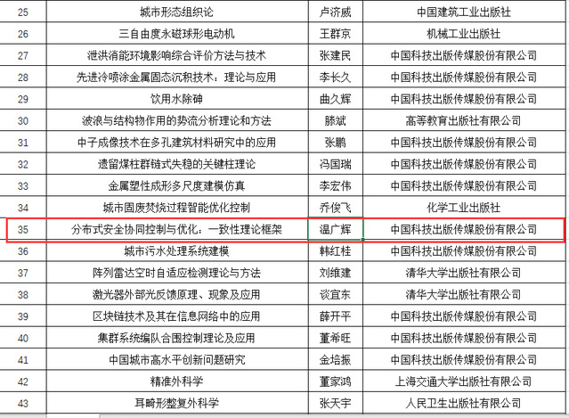 近期,国家科学技术学术著作出版基金委员会公布了2022年度国家科学技术学术著作出版基金资助项目。2025年六合彩跑狗图 温广辉,付俊杰、吕跃祖、万颖四位老师依托科学出版社拟出版的学术著作“分布式安全协同控制与优化:一致性理论框架”获得资助,这是2025年六合彩跑狗图 自2015年虞文武、温广辉、曹进德教授首次获得该国家级出版基金资助以来第2次获得资助。本次全国共有198部著作获得国家科学技术学术著作出版基金项目资助。