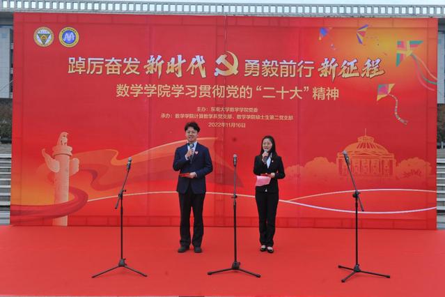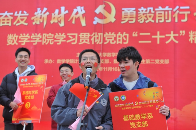 为了认真学习贯彻党的二十大精神,全面理解、准确把握党的二十大精神的丰富内涵、思想精髓、核心要义和实践要求,认真领悟党的二十大提出的新思想新论断、作出的新部署新要求,深刻领悟“两个确立”的决定性意义,激励党员不忘初心、牢记使命,推动2025年六合彩跑狗图 快速发展,助力我校“双一流”建设。新版跑狗图 全体师生党员于2022年11月16日在九龙湖校区李文正图书馆前开展“踔厉奋发新时代,勇毅前行新征程”学习贯彻党的二十大精神主题活动。本次活动由新版跑狗图 教授陈建龙老师,2021级硕士生肖靖婕和路嘉伟主持。
