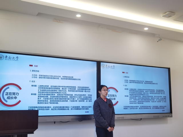 首先,学院邀请有突出成果的2位青年教师代表在经验交流会进行分享。李梦妮老师结合自身经历,介绍了其入职以来的科研经验与成长体会,讲述了在国际著名综合性数学期刊《Adv.Math.》上发表学术论文的过程,分享了自己在科研中从研究老问题到发现新问题的心得感悟,并表示自己还在不断努力成长。