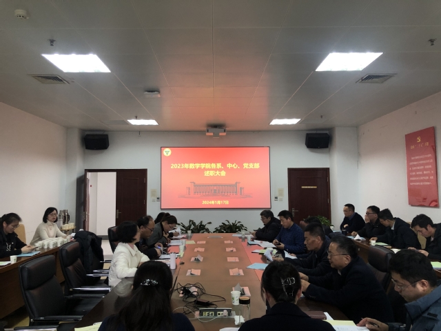 吴映红书记首先代表学院感谢各位支部书记、主任和全体老师一年来为学院发展作出的贡献,她说2023年是全面贯彻落实党的二十大精神的开局之年,学院紧扣“提升年”工作主题,深入落实立德树人根本任务,践行“学术至上、生为首位、师为根基”理念,推进数学学科内涵式高质量发展,希望通过述职的方式全面提升各党支部的组织力,以及各系级单位在促进学院发展过程中的地位与作用,将党建工作与学院中心工作紧密结合起来,使党建工作和行政工作共进步,促进学院更好的发展。随后基础数学系、应用数学系、计算数学系、系统科学系、统计与精算系、丘成桐中心党支部书记或系主任分别从党建工作、各系关键业绩指标(KPI)落实情况等方面汇报了各系的工作,机关也从党建工作、业务工作和管理服务等方面进行了汇报。