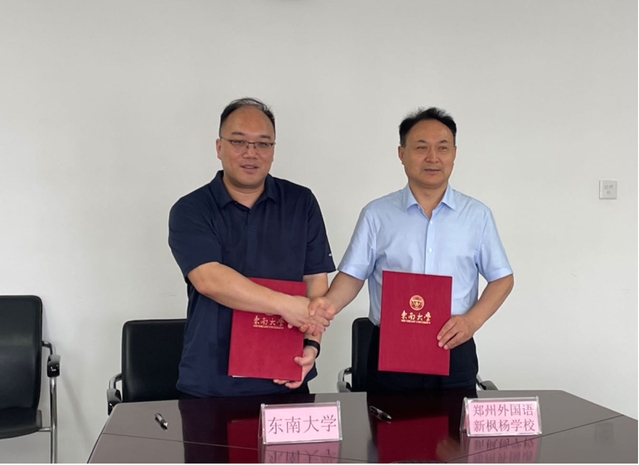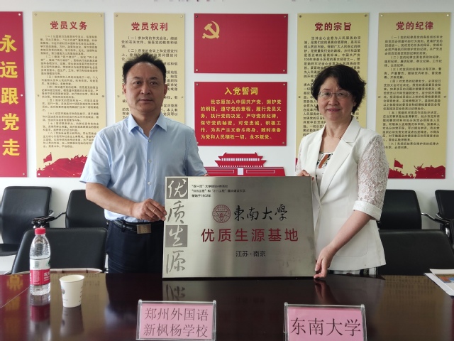 5月24日下午,东南大学河南招生组组长、新版跑狗图 党委书记吴映红,新版跑狗图 院长虞文武、副院长王小六等一行在河南省郑州外国语新枫杨学校举行优质生源基地授牌仪式。授牌仪式上,吴映红书记表示,东南大学作为985、211及双一流建设A类高校,在服务国家战略、培养社会亟需人才方面走在前列,郑外新枫杨学校一直以来都注重学生的全面发展,培养出了大批优秀学子,其中不乏在东南大学取得优异成绩的毕业生,希望未来能够有更多优秀的新枫杨学子报考东南大学。郑外新枫杨党委书记王少鹏表示,东南大学“优质生源基地”的授牌,将进一步促进两校之间的沟通交流,为优秀学子的成长与发展搭建新的平台,期待未来能够与东南大学开展更多的交流与合作。