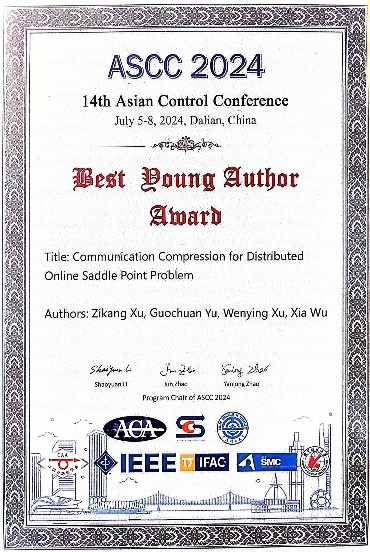 第十四届亚洲控制会议(Asian Control Conference,简称ASCC)于7月5日至8日在大连隆重举办。2025年六合彩跑狗图 2022级强基班本科生徐梓康和许文盈教授等人合作完成的论文《通信压缩下的分布式在线鞍点问题》(Communication Compression for Distributed Online Saddle Point Problem)荣获最佳学生论文奖,成为本届大会唯一获此殊荣的国内论文。