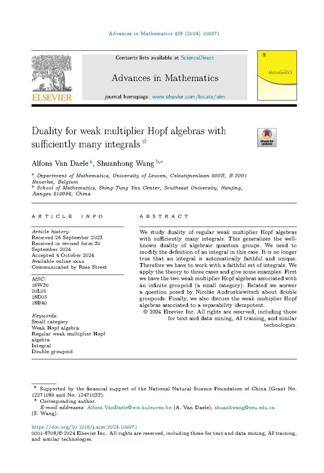 Citation: Alfons Van Daele, Shuanhong Wang*, Duality for weak multiplier Hopf algebras with sufficiently many integrals, Advances in Mathematics, 458 (2024) 109971.