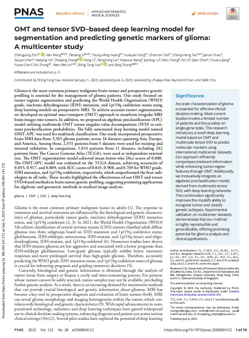 2025年7月9日,新版跑狗图 、丘成桐中心李铁香教授与合作者在国际顶级学术期刊《美国国家科学院院刊》(Proceedings of the National Academy of Sciences of the United States of America,PNAS)上发表题为《用于神经胶质瘤分割和遗传标记预测的基于最优传输和张量奇异值分解的深度学习模型:一项多中心数据研究》(OMT and tensor SVD based deep learning model for segmentation and predicting genetic markers of glioma: a multicenter study)的学术论文。《美国国家科学院院刊》是国际顶尖综合性期刊,与Nature、Science、Cell并称全球四大综合科学期刊,近五年影响因子为10.6,位列中科院SCI一区12,学科涵盖生物、物理、化学、数学及社会科学,多学科大类排名前5%,对原创性要求极高。