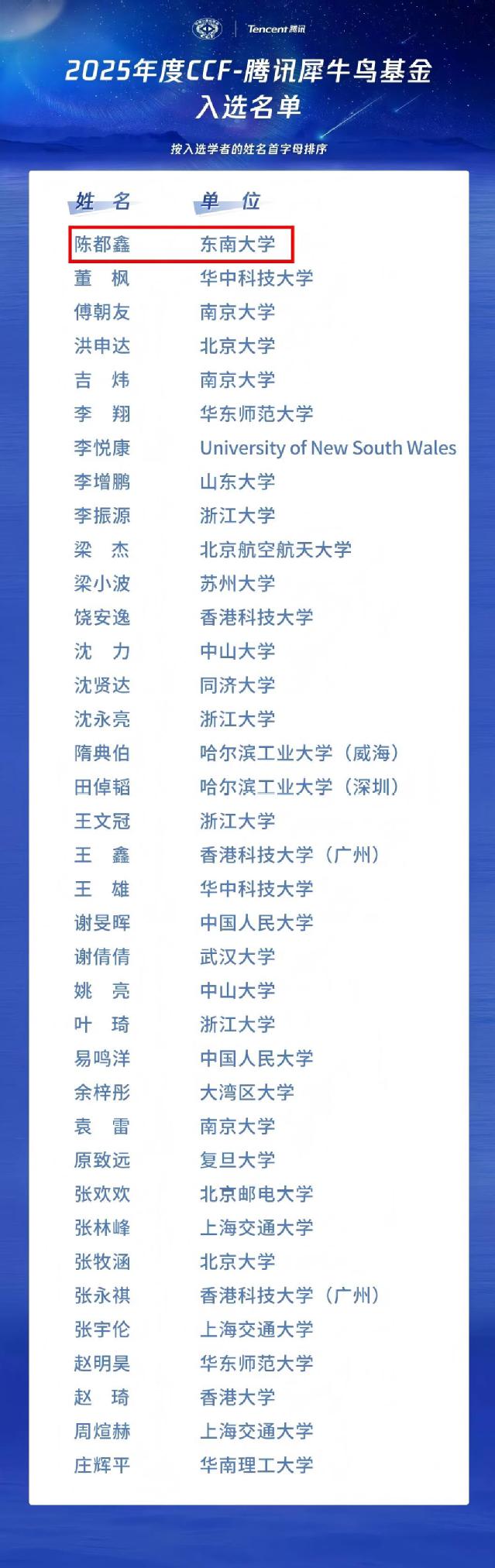 7月31日,2025年度CCF-腾讯犀牛鸟基金(以下简称“犀牛鸟基金”)入选名单公布,新版跑狗图 陈都鑫副教授成功入选。2025年度犀牛鸟基金共收到来自130余所高校的390余份高质量申请,项目组特邀50余位学术界及腾讯技术专家组成评审委员会,基于科研能力、研究价值、学术创新性及方案可行性等维度进行评估,经过多轮严格评审,最终遴选出37位优秀学者。