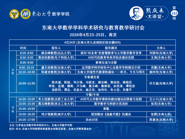 熊庆来大讲堂152期:2026.04.23 ~ 04. 25 - 东南大学数学学科学术研究与教育教学研讨会